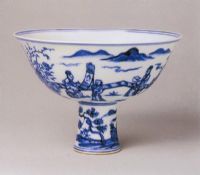 碗撇口,高足中空。外壁繪二仕女對坐賞畫,襯以山水、花草、樹木等,足柄繪山石樹木。碗心青花雙圈內書“大明宣德年制”六字楷書。此器紋飾布局疏朗,場面開闊,意境清雅。