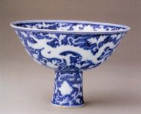 碗撇口,高足中空。里外壁飾青花地留白云龍穿花紋,足柄飾纏枝蓮紋。此器采用青花地留白的裝飾方法,紋飾分外鮮明生動(dòng)。高足碗多用于陳設(shè)供品。