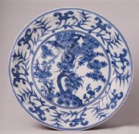 盤敞口,弧壁,圈足。青花紋飾,盤心與外壁繪松,竹,梅,內(nèi)壁環(huán)以相互纏繞的靈芝與竹枝,足墻飾海水紋。內(nèi)壁所繪紋飾為成化官窯的創(chuàng)新,靈芝,自古以來被認(rèn)為是長壽仙草,而竹又諧“祝”音,其與經(jīng)冬不凋的松,竹,梅歲寒三友相配,蘊(yùn)涵“靈性祝壽,天地長春”的美意。