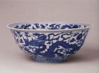 碗撇口,深弧壁,圈足。碗心及內(nèi)外壁通體青花繪穿花龍紋,底青花雙圈內(nèi)書“正德年制”四字楷書款。此碗造型及紋飾也是正德官窯仿宣德青花之作,唯圈足一周如意云頭紋頗有新意。