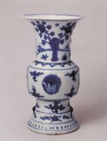 尊撇口,粗長頸,鼓腹,高圈足外撇,尊兩側(cè)各出三戟。青花紋飾六層,頸飾壽石牡丹,寓意“富貴長壽”;腹繪蓮花,喻“事業(yè)興盛”。高足分別以祥云,朵蓮,點紋為飾。