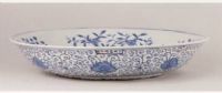 盤敞口,弧壁,圈足。青花紋飾,盤心繪一棲有雙雀的桃樹,里壁繪折枝牡丹,菊花,石榴,桃,外壁繪纏枝靈芝,寓意“富貴長命,靈仙祝壽”。外口沿下方框內(nèi)青花橫書“大明嘉靖年制”六字楷書款。