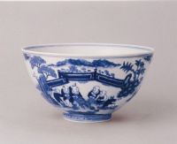 碗敞口,弧壁漸收,圈足。外壁通景青花繪嬰戲圖,一群玩童,或舉荷花,或持長(zhǎng)笛,或玩水,空間襯以洞石、欄桿、花草、流云和遠(yuǎn)山,足墻飾回紋。
