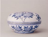 盒呈扁圓形,上下扣合,圈足。通體青花繪折枝繡球花,輔以“丁”字形邊飾。底青花書“體和殿制”四字篆書款。此盒造型渾圓,青花呈色藍(lán)中泛灰。