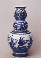 瓶呈葫蘆式,撇口,短頸,頸飾對稱夔鳳耳,雙圓腹,圈足。青花紋飾,口飾如意云頭,頸飾瓔珞、蕉葉、回紋、上腹繪祥云蝙蝠,下腹繪《八仙渡海圖》,列位仙人足踏流云漂于海上。