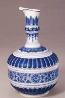 花澆敞口有流,細(xì)長頸,頸中部凸起,圓腹,圈足。青花紋飾,頸飾蕉葉、忍冬、瓔珞紋,頸下飾蓮瓣,肩和近足處凸起,各飾變形蓮瓣紋,腹飾折枝花紋八組。