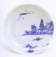 盤敞口,圈足,盤外壁光素,盤內(nèi)青花繪山石、樓臺、水榭風(fēng)景,畫中景致反映了恬靜、安寧的生活美景。