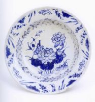 盤折沿,腹略深,外光素,折沿口上青花繪竹子及攀巖的植物和花朵,盤心青花繪以盛開(kāi)的荷花,構(gòu)圖疏密有致,繁而不亂