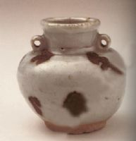 唇口,短頸,圓腹,平底,底部無釉。肩部有圓形雙系。通體施青白釉,器腹釉下點(diǎn)灑褐色斑點(diǎn),係氧化鐵著色。同類造型作品還有青白釉、青花等品種,均為小件器。