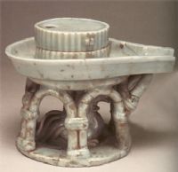 胎質(zhì)潔白堅硬,通體施青白釉,造型構思巧妙,磨齒為幅射狀,中心有圓形漏孔。磨盤為帶流把盤,鏤空仿藤竹編座架,內(nèi)塑一雙公雞,具有濃厚的生活情趣。