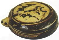 盒蓋呈扁圓形,造型特殊,邊置龜頭繫中空能穿繩。用白地褐彩裝飾,蓋面朝光內(nèi)繪簡筆月影梅紋,蓋內(nèi)正中用褐彩繪“兆兆"紋,近似雙蝶,此褐彩技法為元代吉州窰常見。