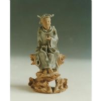 頭戴方巾,身著寬袖長(zhǎng)衫,腰際系有一飄帶,雙足交叉端莊山石上,右手自然垂下,左手微舉在胸前,神態(tài)呈思索狀,面部,手,足,山石,露胎,呈淺醬褐色.施釉部分釉色青灰.
