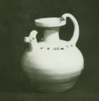 盤口,細(xì)頸,斜肩,球腹,平底內(nèi)凹.肩部飾對稱系,一端飾雞首,引頸高冠,喙作流口(與器身不通),另一端作圓形環(huán) ,口沿飾五個(gè)褐色點(diǎn)彩.
