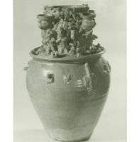 圓口,頸部以四飛鴿四小罐分成四區(qū),正面為四層門樓,左右二闕,門前塑相對二獸和鳥.左、右、后三面各塑舞樂胡人,間以飛鴿.上腹部有鴿、佛像、鳳鳥、鋪獸、熊、龜頭、 麒麟、蜥蜴等.