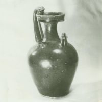 盤口,細(xì)頸,溜肩,斜腹直放,肩部置有對杯雙雞頭,不通和龍扳,橋形系,平底無釉,釉色醬黑,有光澤,同時有流釉和剝釉現(xiàn)象.