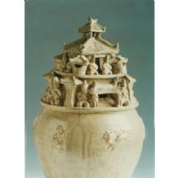 上部作堆塑,下部為罐.腹微鼓,平底,釉不及底.腹上部堆貼二鹿,四執(zhí)棒形人物.上部分三層,第一層前后作單門樓,以倒置獸頭作柱,門口左右各塑胡人一,闕人一.左右兩面均為胡人像三,第二層四小罐覆廡殿式頂,每面塑尖頂降月胡人二,雙手合胸.頂層作重式廡 殿頂.