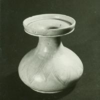 盤口,細頸盤口,細頸,溜肩,垂腹,矮餅足,肩腹刻蓮瓣紋,底部有泥點痕.