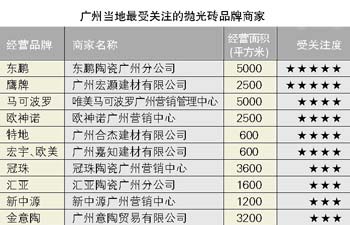 在廣州市場(chǎng),各種拋光磚品牌均有入駐,品牌專賣店超過500家,拋光磚商家數(shù)量占整個(gè)市場(chǎng)的90%左右,主要集中在花花世界陶瓷館、五洲裝飾市場(chǎng)、安華裝飾市場(chǎng)和喜龍建材市場(chǎng)等。
