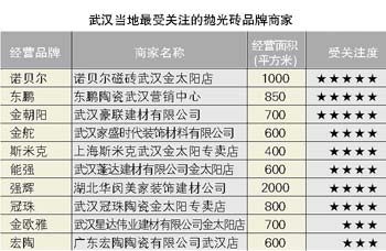 武漢的大部分商家熱衷于經(jīng)營(yíng)具有一定知名度的拋光磚品牌。市場(chǎng)上比較活躍的拋光磚品牌有諾貝爾、東鵬、金朝陽、金舵、斯米克、薩米特、能強(qiáng)、強(qiáng)輝、金歐雅等。當(dāng)?shù)厥袌?chǎng)上經(jīng)營(yíng)拋光磚的商家占建筑陶瓷商戶的近90%。其中比較有影響力的品牌和商戶主要集中在金太陽建材廣場(chǎng)、漢西貨場(chǎng)、時(shí)代建材精品城、康家建材廣場(chǎng)和宜家建材廣場(chǎng)等地。