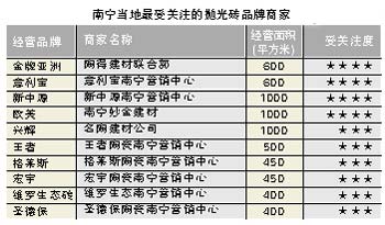 廣西南寧市6大建材市場(chǎng)聚集了國(guó)內(nèi)各中高品牌的拋光磚。目前,南寧市經(jīng)營(yíng)拋光磚的商家約650家,占陶瓷商家的90%,主要集中在南寧市快環(huán)、明秀、虎邱、廣西、富安居和萬泰隆建材市場(chǎng),在每個(gè)建材市場(chǎng)內(nèi),拋光磚商戶幾乎都占多數(shù)。適應(yīng)于南寧整體消費(fèi)水平的中檔拋光磚最為暢銷,價(jià)格仍是消費(fèi)者考慮的首要因素。在同一檔次的品牌面前,消費(fèi)者往往看重產(chǎn)品的價(jià)格,其次是花色。