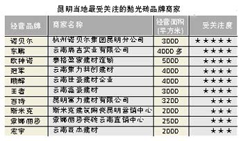 據(jù)調(diào)查,昆明市場目前主要有東鵬、諾貝爾、歐神諾、冠軍、順輝、百特、斯米克、蒙娜麗莎、歐美、鷹牌、格萊斯、新潤成、宏宇、冠珠、金利高、巴丹、合美、廣美瓷磚等拋光磚品牌。據(jù)了解,昆明本地在消費習(xí)慣上,消費者更注重于產(chǎn)品的質(zhì)量、品牌、花色。