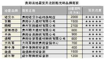 貴陽拋光磚商家占陶瓷經(jīng)銷商7成左右,主要品牌有諾貝爾、東鵬、新中源、蒙娜麗莎、順輝、能強、冠珠、強輝、威爾斯、天偉、大將軍、冠軍、珠江等。主要集中在貴陽金陽西南國際家居博覽城陶瓷A、B館、貴久建材市場、05建材市場和體育路沿街店面。中高檔陶瓷品牌一直受貴陽消費者的歡迎。當(dāng)?shù)叵M者最關(guān)注的是產(chǎn)品的性價比和花色。目前,隨著環(huán)保家裝潮流的興起,陶瓷產(chǎn)品的環(huán)保指標(biāo)成為消費者選磚的又一重要參考。