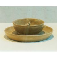 托盤平坦,直口圓唇,斜直壁,平底露胎,盤內(nèi)置一弦紋碗,碗底中央塑一展翅欲飛的鳥,通體施青釉。