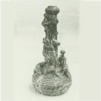 夾砂褐胎,釉不及底,頭部作蒜頭狀,竹節(jié)形長頸,扁圓腹,平底,頸部堆塑一人擁抱瓶的頸部,作攀登狀,背面一人倒立,兩手搭著攀者的右臂,周緣三獸頭相間五飛禽.上腹部飾凹弦弦紋數(shù)周,一人左手執(zhí)棒,右手牽一虎,另一人側(cè)視,左手執(zhí)棒,右手牽龍,,龍虎之間,各塑一引頸巨禽.