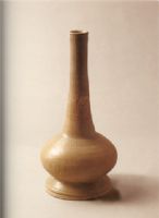小口,細長頸,自上而下逐漸變粗,扁圓腹。矮圈足外撇,上飾有兩道凹弦紋。釉色青黃間雜,質(zhì)感不純,整造型簡潔流暢,為這一時期少見的佳品.