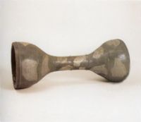 此鼓中間為圓柱,兩頭為喇叭口,如朝鮮婦女使用的腰鼓,中間圓柱上有三條弦稜,兩端口部各有一條弦稜,此稜便于固定鼓面。瓷鼓通過(guò)施黑褐色釉,灰白色花斑,灰色胎,胎質(zhì)堅(jiān)硬,據(jù)近幾年考古發(fā)掘得知,此鼓為耀州窯所制。從陶瓷史來(lái)看,在河南燒此種花釉較多,如河南密縣、扒林窯,魯山窯等,以魯山窯燒此鼓最名,稱魯山花鼓,此鼓與魯山花鼓相近,造型略有差別,為耀州窯提供了可貴資料。