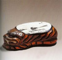 枕形呈臥虎形象,虎背平坦作枕面;姨,施白色化妝土。枕面作腰圓形,內(nèi)以黑彩繪蘆塘鹡鸰圖,具典型中國寫意畫風(fēng)格,筆法瀟灑自如。虎頭及身以黑彩描繪毛發(fā)和斑紋,除眉、眼、口、牙幾處用極淺而薄的褐色輕涂外,余皆罩以較深的褐色。
