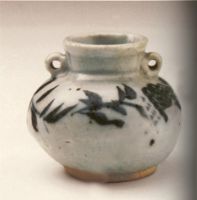 唇口,短頸,圓腹,平底,底露胎,頸、肩間有圓形雙系一對(duì)。通體籬青白色釉,器腹釉下繪青花花草紋一周,青花筆繪隨意,色澤呈藍(lán)黑色。此類造型作品,較多出土于東面亞地區(qū),系元代貿(mào)易瓷器。