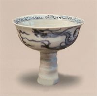 杯敞口,深腹,竹節(jié)形高足。口沿內(nèi)繪青花卷草紋,外壁繪云龍紋,龍為三爪。屬元代景德鎮(zhèn)典型器物,存世較為多見。