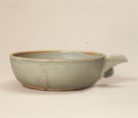 該瓷匜口微斂,平唇,淺腹,平底。其造型類似缽,但在口沿一側(cè)安有一槽狀流,流下附卷云形小鼻。通體施青白釉。口沿及外底部露胎,胎質(zhì)細(xì)膩,在釉與露胎銜接處有火石紅痕。