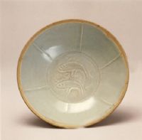 敞口,弧腹壁,矮圈足。內(nèi)腹以出筋分割為六等份,內(nèi)底飾同向雙魚,活潑自在地游于水中。