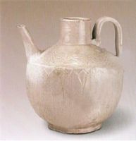 直口,斜肩,圓腹,圈足。肩一側(cè)置流,另一側(cè)置曲柄,肩部刻劃三層仰蓮瓣。通體施白釉。其工藝明顯受到北宋定窯的影響。