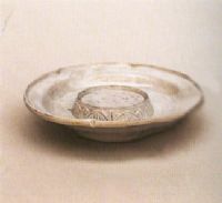 六曲花式盤口,折沿,淺腹,盤心突起圓托,雙圈足。白瓷胎,上白色化妝土,施白色透明釉。托及脛均雕復(fù)瓣蓮紋,紋飾別致,釉面結(jié)拜素雅。盞托亦稱[茶船],為承托茶盞、以防燙手的用具。始于唐,流行于五代之后。