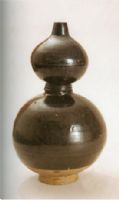 黑釉,圈足,整器造型為葫蘆形,上下腹部都飾有暗花,從暗花紋樣上看繪有荷花、蘆葦和水鳥,猶如一幅江南水鄉(xiāng)的風(fēng)景畫。