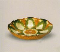模制成型,呈八曲海棠花式,淺腹,弧壁,平底。淡紅色陶胎,上白色化妝土,施三彩釉。碟內(nèi)滿印復瓣蓮花一朵,與碟的造型相重合,使中體碟宛如一朵盛開的蓮花,再配以黃、綠、白三彩釉,更顯得光彩明艷,給人以視覺的享受。此碟設計奇巧,作工精湛,當系赤峰缸瓦窯的產(chǎn)品。