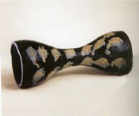 河南魯山縣段店窯制品,腰鼓呈長形,兩端粗大,中間細成凹形,中空。鼓身凸起弦紋七道,裹外施黑釉,外部釉面散佈著幾十塊大斑點,斑點由乳白,茄紫,灰藍等色組成,宛如黑色閃緞的彩色裝飾,靜穆而典雅。