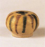 小口,扁圓,鼓腹,假圈足。近足部露灰色胎,施青釉,釉質(zhì)光亮,透明度較強(qiáng),有細(xì)小開片紋?谥粮共坑韵聞蚍Q地加施褐綠兩色長短不一的條形紋飾,由上而下,濃淡自如,流暢自然。釉色鮮艷,器型渾圓,與小巧玲瓏的造型十分協(xié)調(diào)。