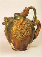 短頸,長圓形腹,平底。肩腹間飾龍首形流和龍形把手。流下印貼一獸頭,兩側(cè)肩腹間貼塑人物及花卉紋。通體施黃綠色釉,釉色鮮麗,流淌熔融,尤其是作品的貼塑工藝之精湛,構(gòu)思之奇巧,反映了唐代制陶工藝的發(fā)達(dá),此類作品,傳世較稀少,是唐代彩色釉陶器中出類拔萃之作。