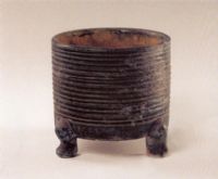 此奩仿漢代造型,圓筒腹,下承三足,器壁裹外施綠釉,外壁從口到底由等距弦紋作飾。整個(gè)器皿端莊雋秀。
