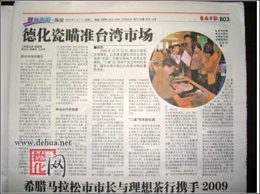 2008年12月12日,德化白瓷到臺灣展出。這次展出意在試試臺灣市場的“水溫”,為德化陶瓷產業(yè)尋找新商機。“三通”后,兩岸產業(yè)合作利好多多,瞄準臺灣市場已久的德化陶瓷蓄勢待發(fā)。