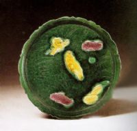 遼三彩盤、碟的裝飾手法有刻、劃、印三種,制作時,先在坯上作出花紋,再依據(jù)花紋的特點施三彩釉。