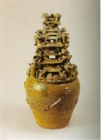 堆塑罐上,塑九層廡殿式樓臺(tái),并塑有闕、鉤欄、廡廊、觀樓。罐身及樓臺(tái)上塑有虎、羊、辟邪、蜥蜴、犬、猴等動(dòng)物,還塑有侍俑、騎辟邪人及拿大鼎、弄丸、彈琴等雜俑二十三人。此罐殿宇巍峨,蔚為壯觀