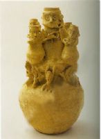 該瓶整個(gè)造型形象地反映了一個(gè)觀看歌舞、雜技的場(chǎng)面。主管系一觀眾,帶著兩個(gè)幼童,一抱懷中,一騎肩上,饒有興趣地看著精彩的演出。