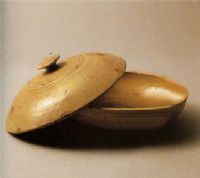 缽體為子母口,淺腹,圓餅形底,外壁口沿處兩道弦紋。蓋作覆盤狀,蘑菇形鈕,鈕上有五點褐彩。通體釉色淡青,開冰裂紋片。該物的造型和裝飾是較為典型的甌窯產(chǎn)品。褐彩在東晉時期浙江地區(qū)的制瓷業(yè)中風(fēng)靡一時,而甌窯的褐彩形式多樣,有點狀、條狀斑塊等。排列組合也千變?nèi)f化。加以它潔白細(xì)膩的胎質(zhì)和淡雅的釉色,達(dá)到了明顯的裝飾效果。