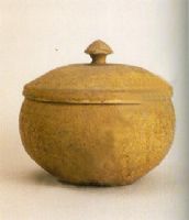 缽斂口,圓唇,鼓腹,平底,帶蓋,蓋為弧形,中央置一蘑菇鈕。通體施釉,釉色黃中泛綠,胎釉結(jié)合不好,已開始脫落。在這件青瓷帶蓋缽上,西晉繁復的裝飾已逐漸消失;從造型和胎釉諸方面來看,與長江下游東晉出土的同類器物相接近,可能是長江下游的產(chǎn)品。