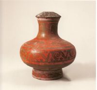 鍾為敞口,細(xì)長(zhǎng)頸,鼓腹,圈足。有碟式小蓋。自頸至足,以白、紅色彩繪出圓點(diǎn)、幾何、抽象人物等圖案。鍾即圓形壺,用以盛裝酒漿或糧食,盛行於漢代。陶鍾是仿照銅鍾制作的明器。